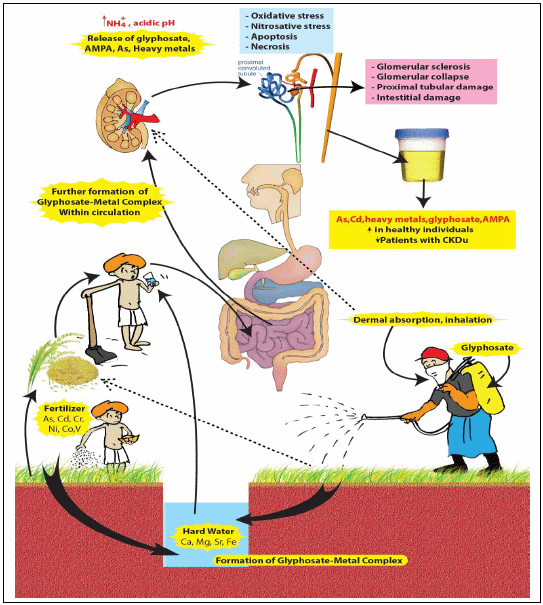 A strong association between the consumption of hard water and the occurrence of this special kidney disease has been observed, but the relationship has not been explained consistently. Here, we have hypothesized the association of using glyphosate, the most widely used herbicide in the disease endemic area and its unique metal chelating properties. The possible role played by glyphosate-metal complexes in this epidemic has not been given any serious consideration by investigators for the last two decades. Furthermore, it may explain similar kidney disease epidemics observed in Andra Pradesh (India) and Central America. Although glyphosate alone does not cause an epidemic of chronic kidney disease, it seems to have acquired the ability to destroy the renal tissues of thousands of farmers when it forms complexes with a localized geo environmental factor (hardness) and nephrotoxic metals.